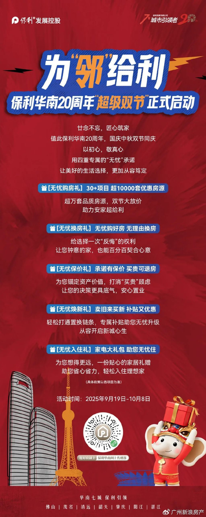 具体而言,保利华南推出主题为“为邻给利”的20周年超级双节促销活动,用五重专属的“无忧”承诺,让购房者美好生活的选择,更加从容笃定。