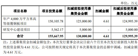本次发行的募集资金总额不超过129,995.39万元(含本数),扣除发行费用后将全部用于年产4,000万平方米高等级覆铜板项目、研发中心建设项目。