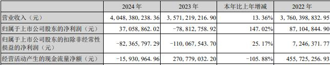 据公司2024年年报,报告期内,公司实现营业收入40.48亿元,同比增长13.36%;归属于上市公司股东的净利润3705.89万元,同比增长147.02%;归属于上市公司股东的扣非净利润为-8236.58万元,2023年为-1.10亿元;经营活动产生的现金流量净额为-1593.10万元,同比减少105.88%。