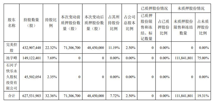 2025年8月16日,完美世界发布关于公司控股股东股份质押及解除质押的公告。公司近日收到控股股东完美世界控股集团有限公司(简称“完美控股”)通知,获悉其持有的公司部分股份进行了质押及解除质押。截至公告披露日,完美控股持有完美世界432,907,448股,持股比例22.32%。本次变动后质押股份数量48,450,000股,占其所持股份比例11.19%,占公司总股本比例2.50%。