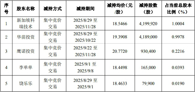 新加坡科瑞技术于2025年8月29日至2025年11月28日期间,通过二级市场集中竞价累计减持公司股份4,199,920股,减持比例为1.0004%,减持均价为18.5466元/股;华苗投资于2025年8月29日至2025年10月22日期间,通过二级市场集中竞价累计减持公司股份4,189,000股,减持比例为0.9978%,减持均价为19.3908元/股;鹰诺投资于2025年9月22日至2025年11月28日期间,通过二级市场集中竞价累计减持公司股份930,400股,减持比例为0.2216%,减持均价为20.7720元/股。高级管理人员李单单通过二级市场集中竞价累计减持公司股份165,000股,减持比例为0.0393%,减持均价为18.4498元/股;饶乐乐通过二级市场集中竞价累计减持公司股份79,900股,减持比例为0.0190%,减持均价为18.4633元/股。