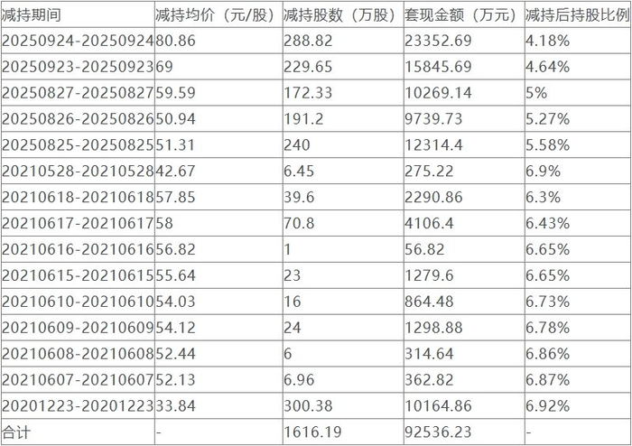 据新浪财经,数据显示,杭州长川投资管理合伙企业(有限合伙)最初持股2470.95万股,占总股本的7.87%。杭州长川投资管理合伙企业(有限合伙)从2020年12月23日起,第一次减持长川科技股份,迄今为止,累计减持公司股票1616.19万股,累计套现约9.25亿元。