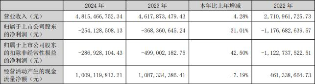 公司归属于上市公司股东的扣除非经常性损益的净利润已连续亏损7年。2024年,公司实现营业收入48.15亿元,同比增长4.28%,2023年为46.18亿元,2022年为27.11亿元,2021年为29.21亿元,2020年为16.07亿元,2019年为9.91亿元,2018年为20.39亿元;归属于上市公司股东的净利润-2.54亿元,2023年为-3.68亿元,2022年为-11.77亿元,2021年为-8.22亿元,2020年为4536.05万元,2019年为-4.04亿元,2018年为21.84亿元;归属于上市公司股东的扣除非经常性损益的净利润-2.87亿元,2023年为-4.99亿元,2022年为-11.23亿元,2021年为-7.51亿元,2020年为-6.48亿元,2019年为-4.69亿元,2018年为-3434.60万元;2024年,公司经营活动产生的现金流量净额10.09亿元,同比减少7.19%。