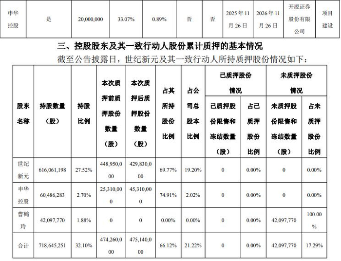 公司11月28日披露关于控股股东解除质押及一致行动人进行股份质押的公告,公司近日接到控股股东陕西世纪新元商业管理有限公司(简称“世纪新元”)及其一致行动人申华控股集团有限公司(简称“申华控股”)的通知,2025年11月26日世纪新元使用其持有的公司部分股份与开源证券股份有限公司进行的股票质押式回购交易已办理了解除质押。同日,申华控股使用其持有的公司部分股份与开源证券股份有限公司进行了股票质押式回购交易。申华控股本次质押股份数量20,000,000股,占其所持股份比例33.07%,占公司总股本比例0.89%,质押起始日2025年11月26日。截至公告披露日,世纪新元及其一致行动人所持质押股份475,140,000股,占其所持股份比例66.12%,占公司总股本比例21.22%。
