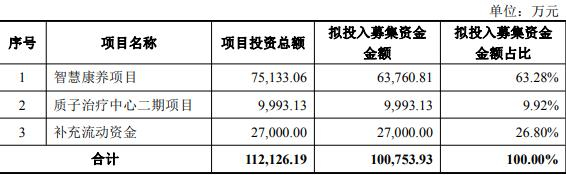 公司本次向特定对象发行股票拟募集资金总额不超过100,753.93万元(含),扣除发行费用后,募集资金拟投资于智慧康养项目、质子治疗中心二期项目、补充流动资金。