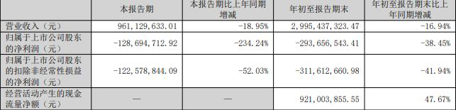 年初至报告期末,公司实现营业收入29.95亿元,同比减少16.94%;归属于上市公司股东的净利润-2.94亿元;归属于上市公司股东的扣除非经常性损益的净利润为-3.12亿元;经营活动产生的现金流量净额9.21亿元,同比增长47.67%。