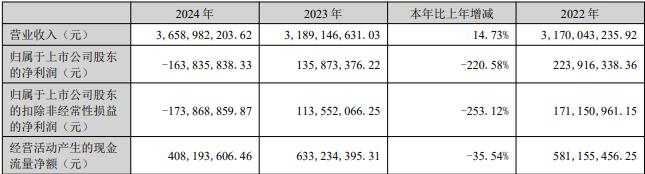 2024年,公司实现营业收入36.59亿元,同比增长14.73%;归属于上市公司股东的净利润-1.64亿元,同比减少220.58%;归属于上市公司股东的扣除非经常性损益的净利润-1.74亿元,同比减少253.12%;经营活动产生的现金流量净额4.08亿元,同比减少35.54%。
