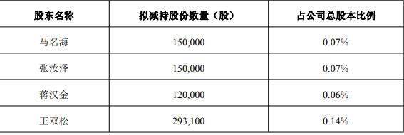 公司10月15日披露关于公司董事、高级管理人员股份减持计划的预披露公告,公司董事、副总经理马名海持有公司股份600,000股,占总股本比例0.28%,计划在公告披露之日起15个交易日后的3个月内(即2025年11月6日至2026年2月5日)以集中竞价方式或大宗交易方式减持公司股份不超过150,000股,即不超过公司总股本的0.07%;公司副总经理张汝泽持有公司股份600,000股,占总股本比例0.28%,计划在公告披露之日起15个交易日后的3个月内以集中竞价方式或大宗交易方式减持公司股份不超过150,000股,即不超过公司总股本的0.07%;公司副总经理蒋汉金持有公司股份480,000股,占总股本比例0.23%,计划在公告披露之日起15个交易日后3个月内以集中竞价方式或大宗交易方式减持公司股份不超过120,000股,即不超过公司总股本的0.06%;公司副总经理兼董事会秘书王双松持有公司股份1,172,400股,占总股本比例0.56%,计划在公告披露之日起15个交易日后的3个月内以集中竞价方式或大宗交易方式减持公司股份不超过293,100股,即不超过公司总股本的0.14%。
