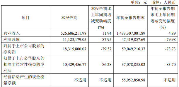 前三季度,普冉股份营业收入为14.33亿元,同比增长4.89%;归属于上市公司股东的净利润0.59亿元,同比下降73.73%;归属于上市公司股东的扣除非经常性损益的净利润0.37亿元,同比下降83.70%。