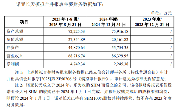 据模拟合并报表主要财务数据,2024年度、2025年1至8月,诺亚长天营业收入分别为86,329.95万元、68,716.74万元,净利润分别为2,245.38万元、4,749.34万元。
