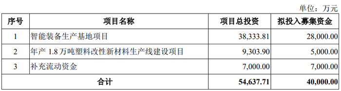 祥和实业10月31日披露的向不特定对象发行可转换公司债券证券募集说明书(申报稿)显示,公司拟发行可转债募集资金总额不超过人民币40,000.00万元(含40,000.00万元),扣除发行费用后拟用于智能装备生产基地项目、年产1.8万吨塑料改性新材料生产线建设项目、补充流动资金。