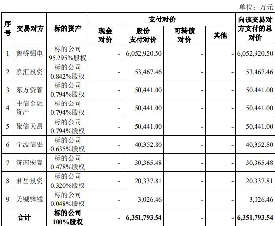公司12月3日披露的《重大资产重组报告书(上会稿)》显示,本次交易方案为上市公司通过发行股份的方式购买魏桥铝电、嘉汇投资、东方资管、中信金融资产、聚信天昂、宁波信铝、济南宏泰、君岳投资、天铖锌铖持有的标的宏拓实业100%股权。本次交易完成后,标的宏拓实业将成为上市公司的全资子公司。