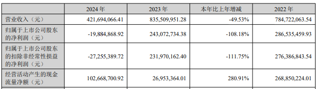 公司2024年实现营业收入4.22亿元,同比下降49.53%;归属于上市公司股东的净利润-1988.49万元,上年同期为2.43亿元;归属于上市公司股东的扣除非经常性损益的净利润-2725.54万元,上年同期为2.32亿元;经营活动产生的现金流量净额1.03亿元,同比增长280.91%。