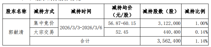 近日,公司收到郭献清出具的《股份交易进展告知函》,获悉该股东的股份减持计划已实施完毕。郭献清于2026年3月3日至3月6日通过集中竞价及大宗交易合计减持3562400股,占总股本1.14%,减持均价分别为52.45元/股、56.87-60.15元/股。