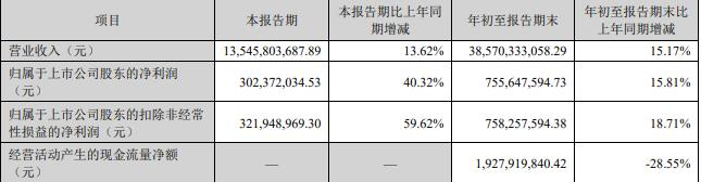 年初至报告期末,公司实现营业收入385.70亿元,同比增长15.17%;归属于上市公司股东的净利润7.56亿元,同比增长15.81%;扣除非经常性损益后的净利润7.58亿元,同比增长18.71%,经营活动产生的现金流量净额19.28亿元,同比减少28.55%。
