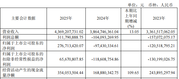 华正新材昨日晚间披露2025年年度报告显示,2025年实现营业收入43.69亿元,同比增长13.05%;归属于上市公司股东的净利润2.77亿元,上年同期为-9743.03万元;归属于上市公司股东的扣除非经常性损益的净利润6567.08万元,上年同期为-1.19亿元。2023年归属于上市公司股东的净利润-1.21亿元。