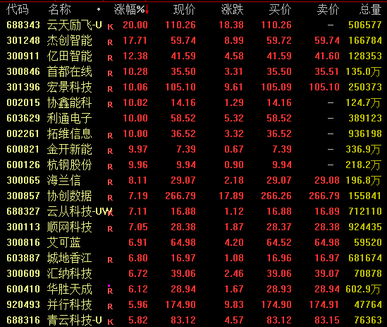 算力概念盘中走势活跃,截至收盘,云天励飞20%涨停,杰创智能涨近18%,宏景科技涨超10%,利通电子、拓维信息等亦涨停。