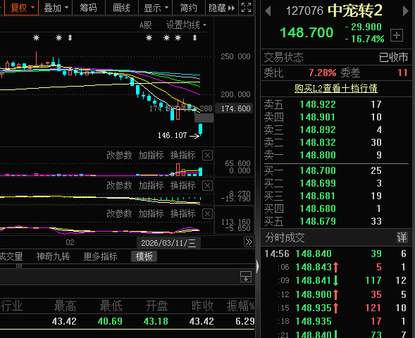 3月16日,中宠转2低开9.85%后持续下跌,收盘跌16.74%,报148.70元/张。
