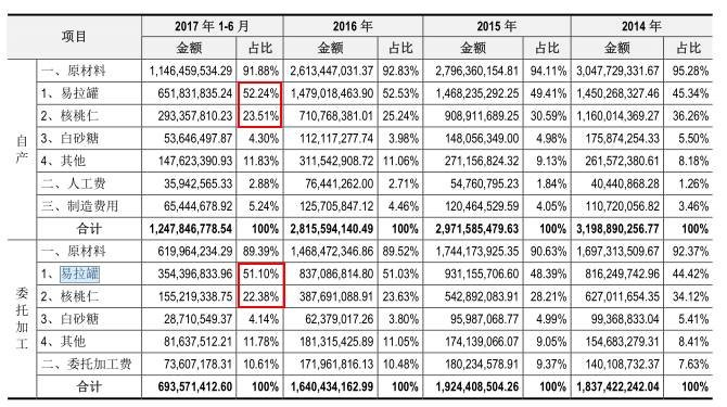 面对质疑,养元饮品澄清“六个核桃”为注册商标,并非实质含量。其招股书进一步揭示了产品的成本结构:在原材料成本中,易拉罐占比高达52.18%,而核桃仁仅占23.3%。换算可知,一罐产品的核桃仁成本仅约0.23元,尚不及包装罐的一半。这种“包装比内容物更值钱”的成本配置,与其高端营养饮品的市场定位形成鲜明反差。