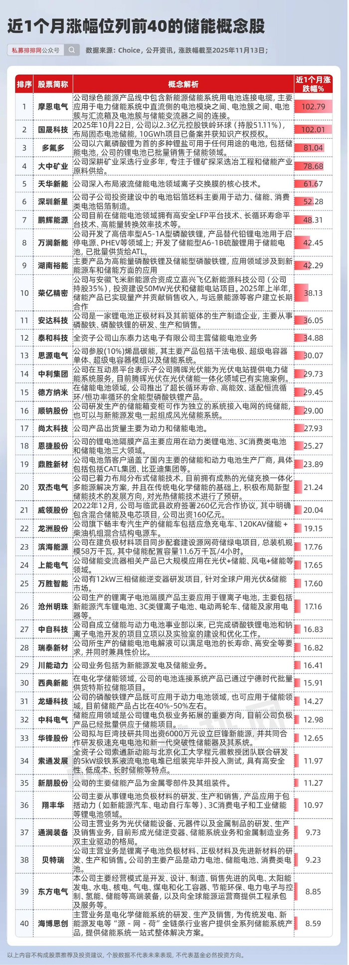 因此,笔者在新型储能概念的核心A股公司中,整理出近1个月涨幅居前40的公司,以供大家参考。