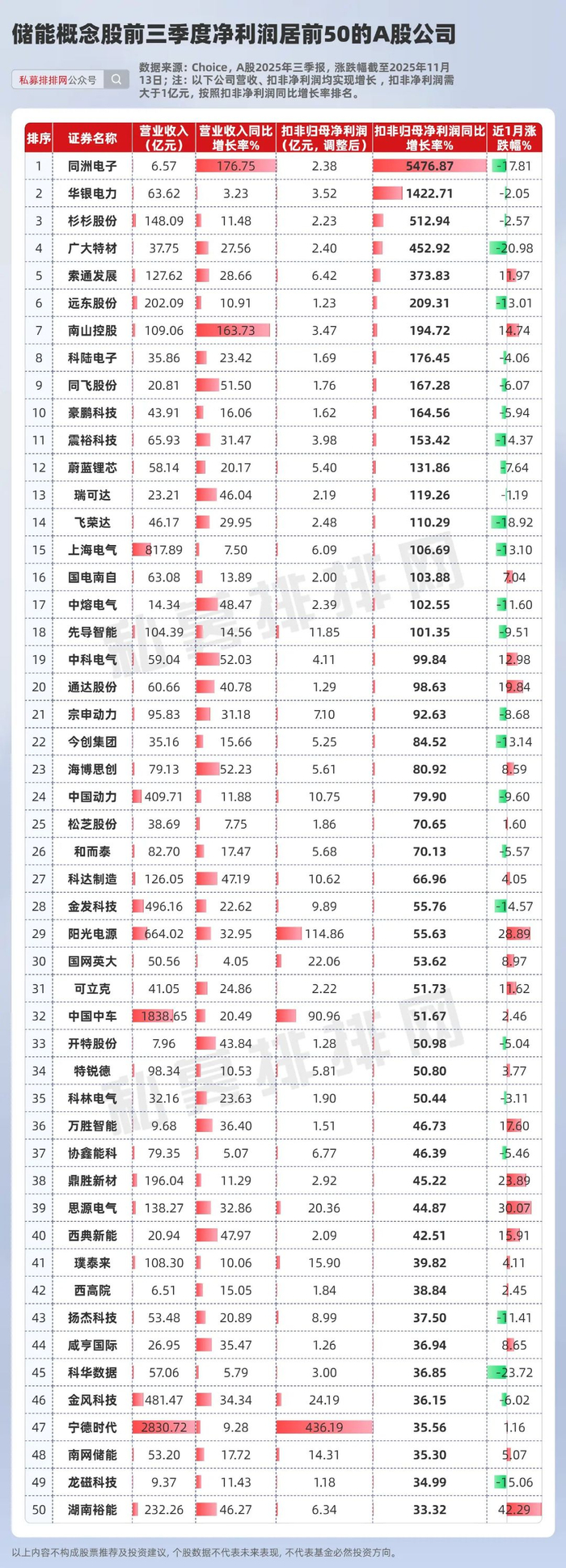 在此基础上,笔者为大家筛选出,2025年前三季度扣非净利润位居前50的储能概念A股公司,供大家参考。其中,同洲电子扣非净利润增长率位居首位,达到54.77倍。(点此领取名单)