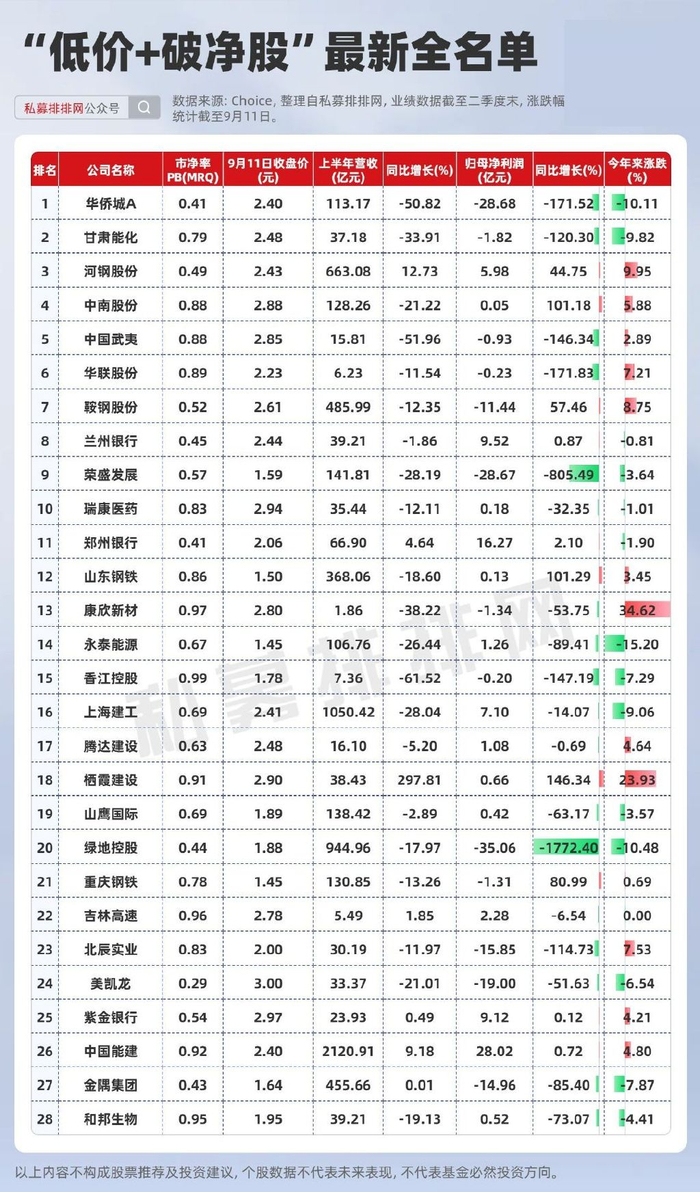 值得注意的是,在这28只破净低价股中,多数业绩较差,因此其真实净资产可能并不如报表那么高。比如华侨城A最新市净率为0.41,9月11日收盘价为2.4元,上半年公司营收为113.17亿元,同比大减50.82%,上半年净亏损高达28.68亿元,同比-171.52%。