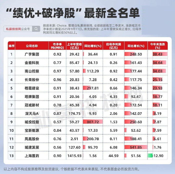 根据私募排排网梳理,截至9月11日收盘,全市场293只破净股中,上半年公司营业收入同比实现正增长,归母净利润同比大增在50%以上的绩优破净股仅13只。经笔者观察发现,这13只绩优破净股今年来的股价涨幅,相比所有破净股的表现明显优秀许多。