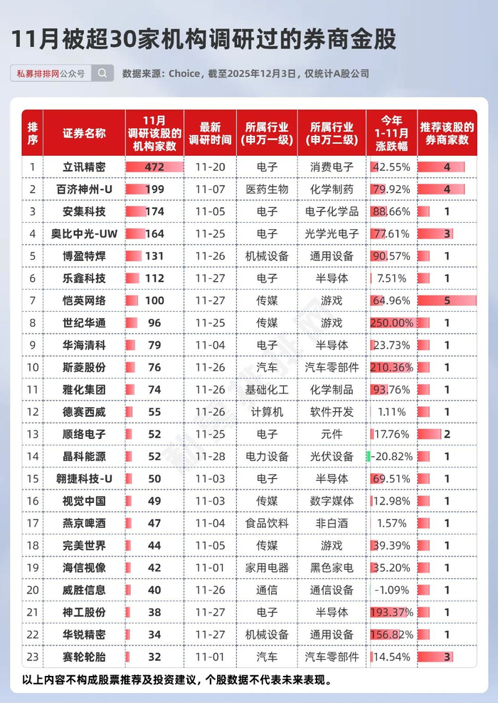此外,经笔者梳理发现,有多只金股在11月被机构扎堆调研过。机构调研是机构投资者了解上市公司的重要手段,一定程度上也代表了机构的关注度。