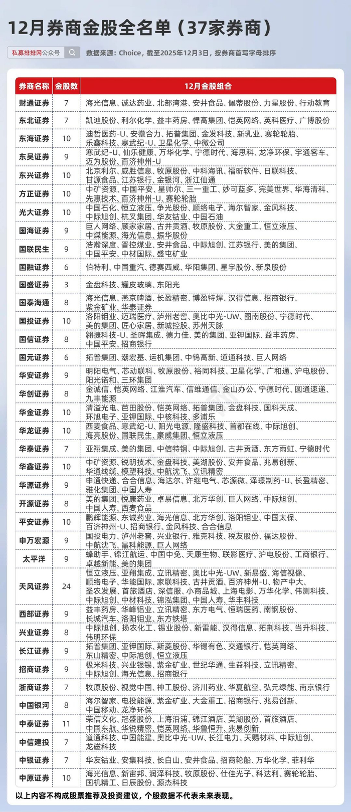 具体到个股层面,截至2025年12月3日,已经有37家券商披露了12月份的金股组合,共涉及230家A股公司,其中有多家A股公司被不同券商共同推荐。(本文仅统计券商金股中的A股公司。)