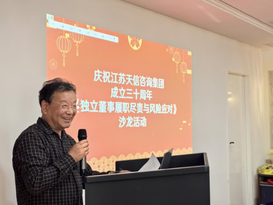 活动主办方,江苏天信咨询集团董事长、独立董事余新平首先在致辞中表示,为了有力提高独立董事的履职能力和履职水平,帮助独立董事准确把握职责定位,有效识别及应对履职过程中的各类风险,促进上市公司规范运作和高质量发展,我们特别举办本次“独立董事履职尽责与风险应对”沙龙,通过本次沙龙活动,提升我们对履职的认识。