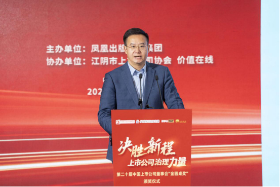 凤凰出版传媒集团总经理李贞强首先致开幕辞。他表示,作为综合性文化传媒企业,凤凰出版传媒集团总资产超730亿元、净资产超530亿元,连续十七届入选“全国文化企业30强”,旗下凤凰传媒连续五年入选“全球出版50强”,是当之无愧的国内出版行业龙头。致辞中,李贞强总经理深情回顾了《董事会》杂志21年来的发展历程,指出杂志始终秉持专业精神,已成为中国公司治理领域最具影响力的专业财经媒体。“金圆桌奖”作为杂志的品牌活动,历经二十届的精心打造,累计超过700家上市公司上榜,生动记录并展现了中国上市公司在公司治理和转型发展方面的卓越成就,为推动完善中国特色现代企业制度、建设世界一流企业作出了重要贡献。