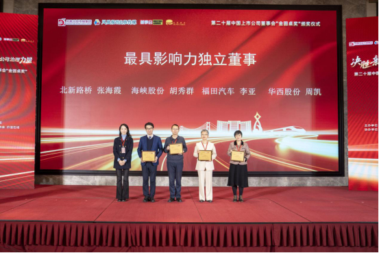 在备受瞩目的颁奖环节,活动依次揭晓了多项重量级奖项,对在董事会建设、公司治理和价值创造等方面表现卓越的上市公司及个人进行了集中表彰,《董事会》杂志特别邀请了凤凰出版传媒集团总经理李贞强,中国船舶股份董事、总经理施卫东,与会专家及上市公司协会领导,凤凰报刊社社长、《董事会》总编辑葛云等一起为获奖个人和公司颁奖。个人奖项部分,北新路桥张海霞、海峡股份胡秀群、福田汽车李亚、华西股份周凯荣获“最具影响力独立董事”这份殊荣。