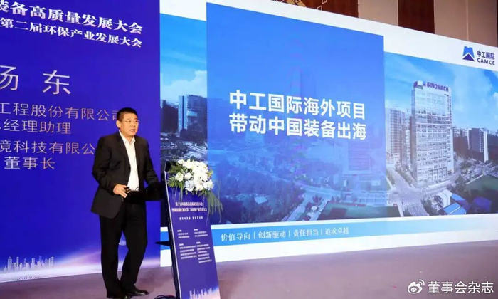 中国环保机械行业协会会长于鸿立、南京大学教授任洪强、中国科学院安徽光学精密机械研究所研究员刘文清等领导专家学者出席大会并发表演讲。会上,中工国际总经理助理、所属中工环境科技董事长杨东受邀发表题为《中工国际海外项目带动中国装备出海 》的演讲。杨东围绕公司“十四五”战略落地成效,系统地介绍了公司近年来在国际化经营和环保领域的战略布局与发展成果,重点阐述了公司在先进装备研发制造方面的技术突破与产品优势。杨东详细解读了公司以海外项目为载体,带动国产优质装备规模化出海的实践路径,分享了项目实施中推动技术适配“走出去”、开展属地化运营的宝贵经验,并结合行业发展趋势,分析展望了国际环保装备市场的需求特点与发展机遇。
