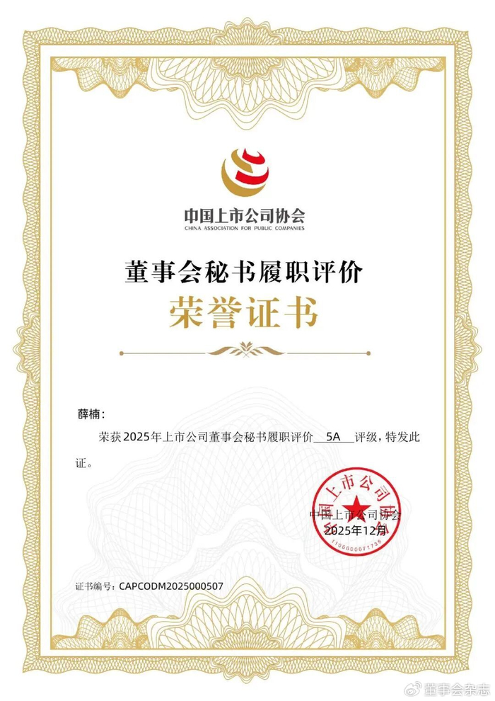 “上市公司董事会秘书履职评价”已经连续开展四年,旨在进一步提高董事会秘书履职能力和职业素养,推动公司治理水平整体提升。评价指标涵盖了规范操作、信息披露、内部控制、投资者关系管理、社会责任等十大标准,67项指标。今年共有36个辖区的1571位董事会秘书入围,占同期在任上市公司董事会秘书总数的28.36%。公司董事、副总裁、董事局秘书薛楠女士代表公司连续四年荣获上市公司董事会秘书履职评价“5A”最高评级,在沪深北三市五千余家上市公司中,仅有282家上市公司董事会秘书荣获此评级。