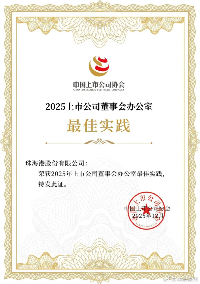 珠海港消息,近期,中国上市公司协会陆续发布关于上市公司治理与可持续发展等相关权威奖项的评选结果,珠海港股份有限公司(以下简称“公司”)再度荣获中国上市公司协会“上市公司董事会秘书履职评价‘5A’最高评级”“上市公司董事会优秀实践案例”“上市公司董事会办公室最佳实践”及“2025年上市公司可持续发展优秀实践案例”奖项。
