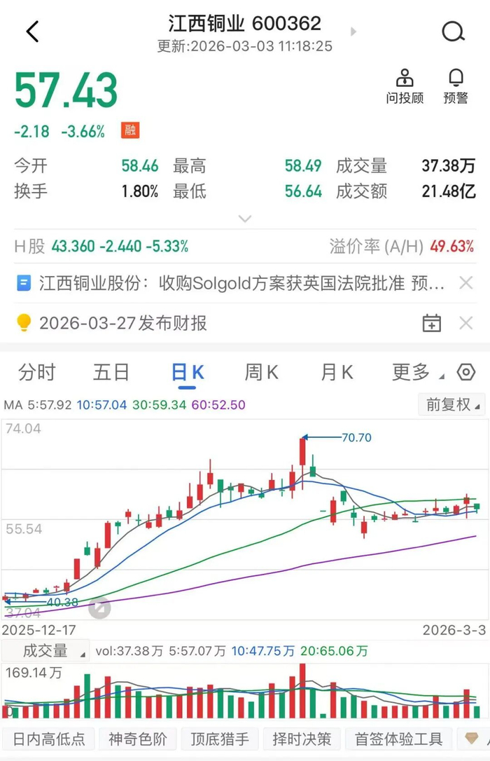 截至今天上午11:18,江西铜业(600362)报57.34,跌幅3.66%。