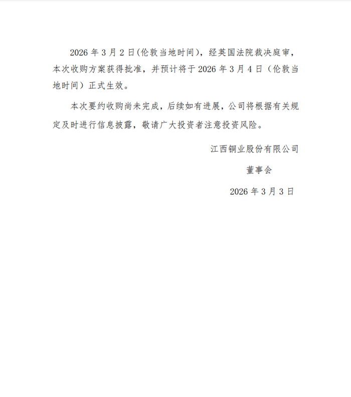 人民财讯3月3日电,江西铜业(600362)3月3日早间公告,公司于2025年12月24日(伦敦当地时间)通过全资子公司江西铜业(香港)投资有限公司,以每股28便士现金就收购SolGold plc全部已发行及将要发行股本(不包括公司现已持有的股份)发出正式要约。2026年3月2日(伦敦当地时间),经英国法院裁决庭审,本次收购方案获得批准,并预计将于2026年3月4日(伦敦当地时间)正式生效。