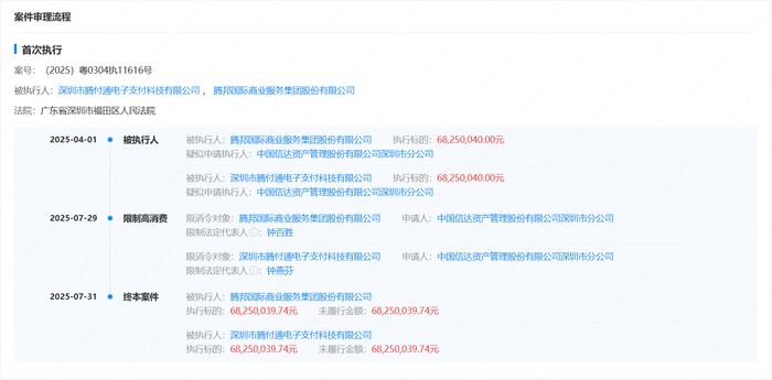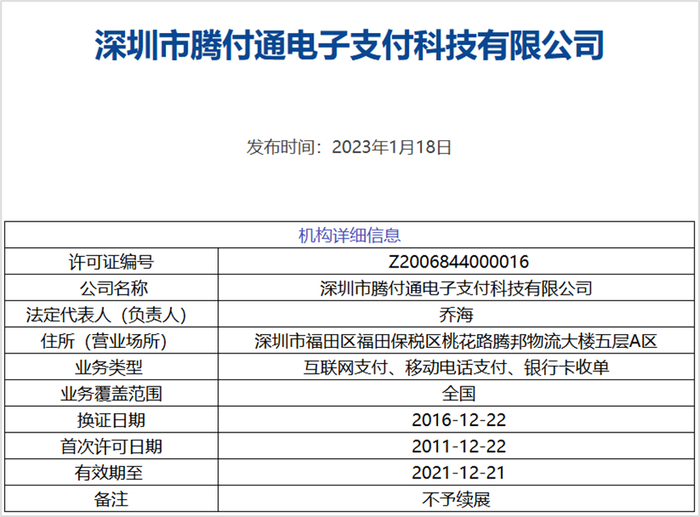 近日,深圳市福田区人民法院裁定(2025)粤0304执11616号终本,深圳市腾付通电子支付科技有限公司须履行6825万元给付义务。据悉,该公司《支付业务许可证》已于2023年1月18日被央行“不予续展”并注销。