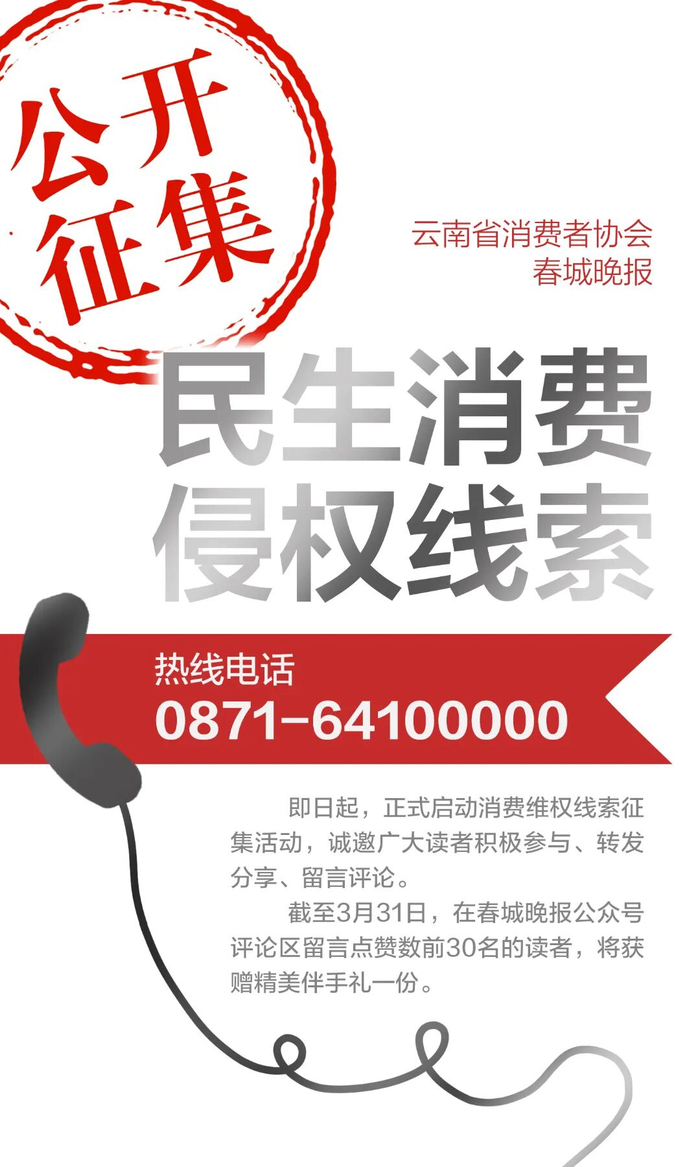 为切实守护消费者合法权益,优化全省消费环境,助力“放心消费在云南”建设,云南省消费者协会联合春城晚报面向社会公开征集民生消费与新业态领域侵权问题线索。本次征集聚焦群众急难愁盼,覆盖民生商品、服务消费、数字新消费、云南特色消费及其他突出侵权问题,坚持问题导向、民生导向,把维权触角延伸到消费全链条、各环节,以舆论监督+专业维权合力,让消费更安心、更放心。
