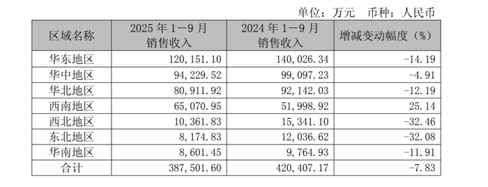 图据公告根据养元饮品三季度经营数据,该公司在华东、华中、华北等七大销售区域的销售收入全线下滑。其中东北地区、西北地区销售收入降幅最大,分别下滑32.08%、32.46%。