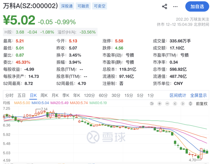 股价表现方面,上周万科A(000002.SZ)一度下探至4.7元/股,续创2016年以来新低,之后股价迅速反弹,当日冲至涨停收盘,截至本周五收盘,报5.02元/股,市值为598.92亿元。