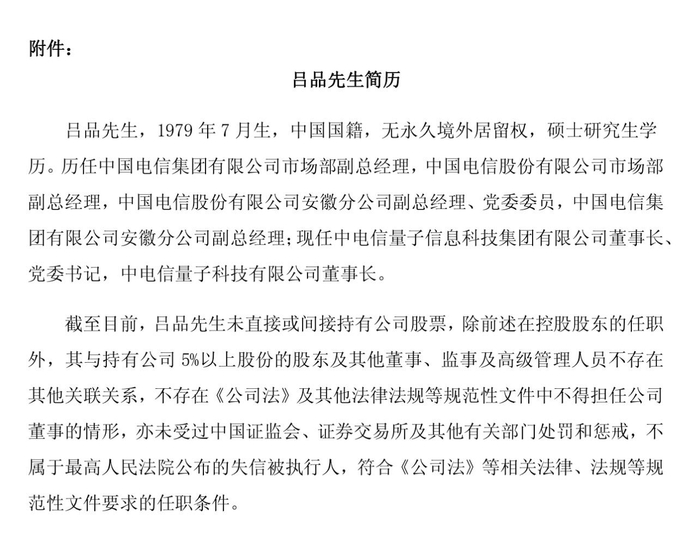 国盾量子今年5月披露的简历显示,吕品出生于1979年7月,中国国籍,无永久境外居留权,硕士研究生学历。他历任中国电信集团有限公司市场部副总经理,中国电信股份有限公司市场部副总经理,中国电信股份有限公司安徽分公司副总经理、党委委员,中国电信集团有限公司安徽分公司副总经理;现任中电信量子信息科技集团有限公司董事长、党委书记,中电信量子科技有限公司董事长。