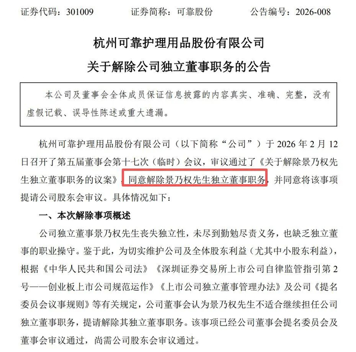 2月23日下午,可靠股份(301009.SZ)发布公告称,其董事会审议通过《关于解除景乃权先生独立董事职务的议案》,同意解除景乃权独立董事职务,并同意将该事项提请公司股东会审议。