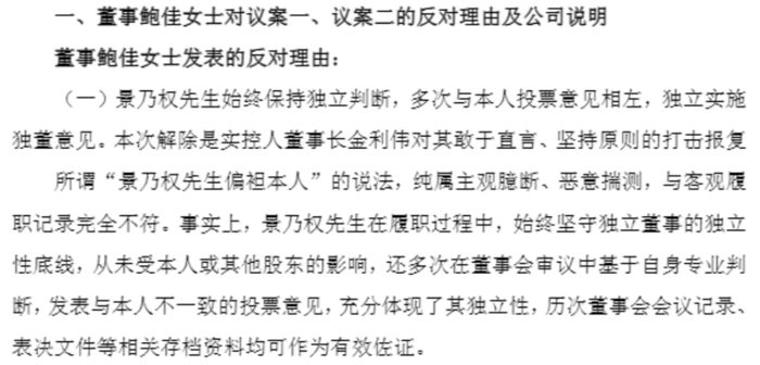 鲍佳直言,此次解任是实控人对景乃权坚持独立履职的打击报复,认为公司所述“景乃权偏袒自己”系主观臆断,并指出景乃权曾在公司违规关联交易议案中审慎弃权,印证了其独立性。她还质疑部分董事“橡皮图章”式履职,同时强调自身2024年薪酬增长为合理业务提成,有相关凭证佐证。