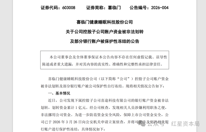 红星资本局3月28日消息,3月27日,“中国床垫第一股”喜临门(603008.SH)发布公告,披露旗下控股子公司账户资金被非法划转且公司已对部分银行账户实施保护性冻结的相关事项。