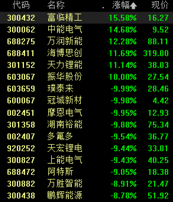 个股方面,富临精工跌超15%,中能电气、海博思创、万润新能等多股跌超10%,阿特斯、鹏辉能源、永福股份、奥特迅、派能科技跌幅居前。