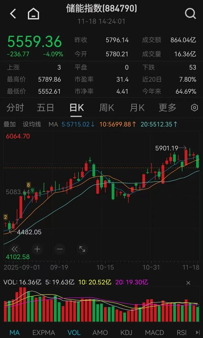11月18日,储能概念午后持续调整。Wind数据显示,截至发稿,储能指数跌超4%。截至昨日收盘,该指数月内累计涨5.71%。