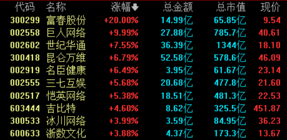 富春股份20%涨停,巨人网络涨停,世纪华通涨超7%,名臣健康、昆仑万维涨超6%,三七互娱、掌趣科技等纷纷拉升;板块内个股全线飘红。