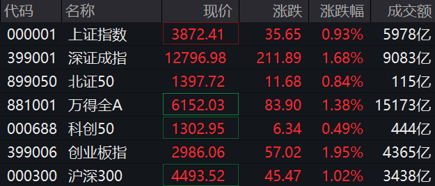截至发稿,沪指涨近1%,深成指涨超1%,创业板指涨近2%。Wind数据显示,全市场上涨个股超4500只。