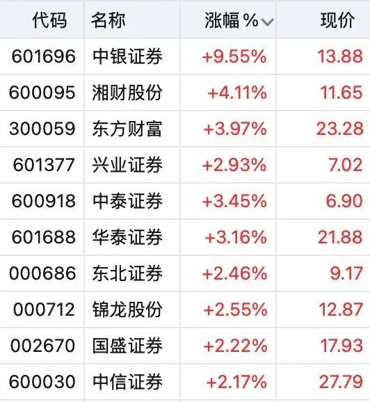 券商股方面,截至发稿,中银证券大涨超9%,湘财股份、东方财富、兴业证券等跟涨。